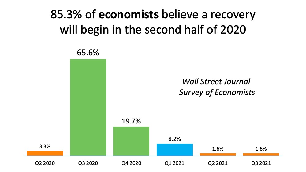According to the latest Wall Street Journal Economic Forecasting Survey, which polls more than 60 economists on a monthly basis, 85.3% believe a recovery will begin in the second half of 2020 (see graph below):