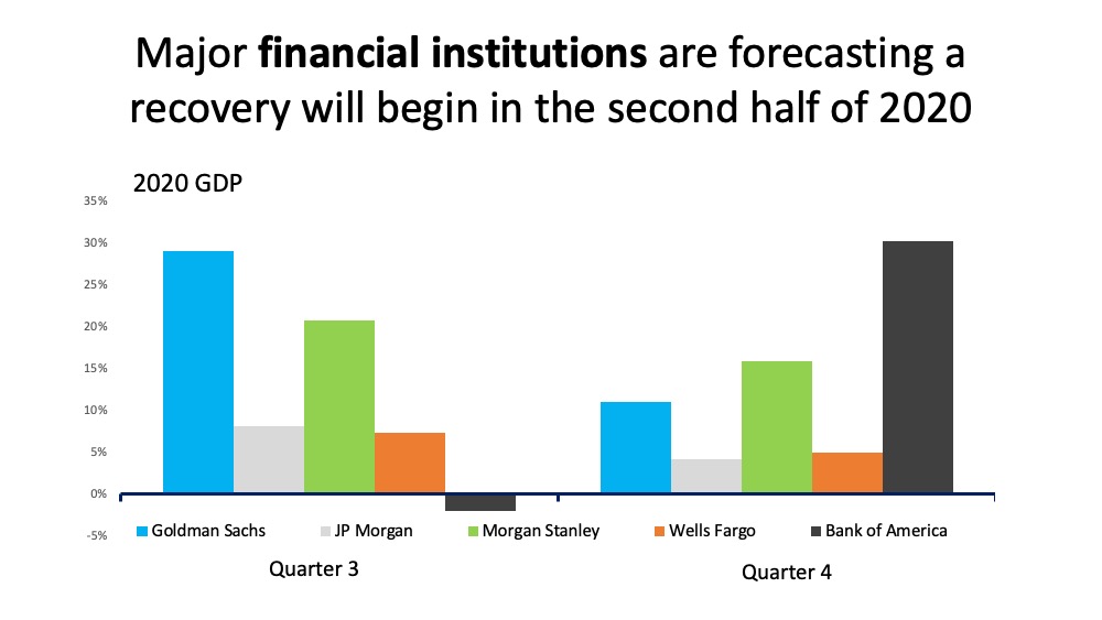 In addition, five of the major financial institutions are also forecasting positive GDP in the second half of the year. Today, four of the five expect a recovery to begin in the third quarter of 2020, and all five agree a recovery should start by the fourth quarter (see graph below):