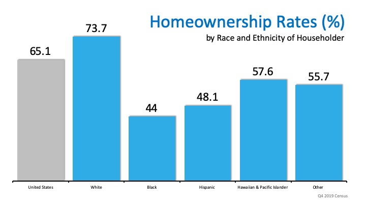 “The homeownership rate for black Americans in 2019’s fourth quarter rose to 44%, a seven-year high, increasing from the record low it reached in 2019’s second quarter. The rate for Hispanic Americans was 48.1%, a two-year high, the Census data showed…The rate for white Americans was 73.7%, an eight-year high.”