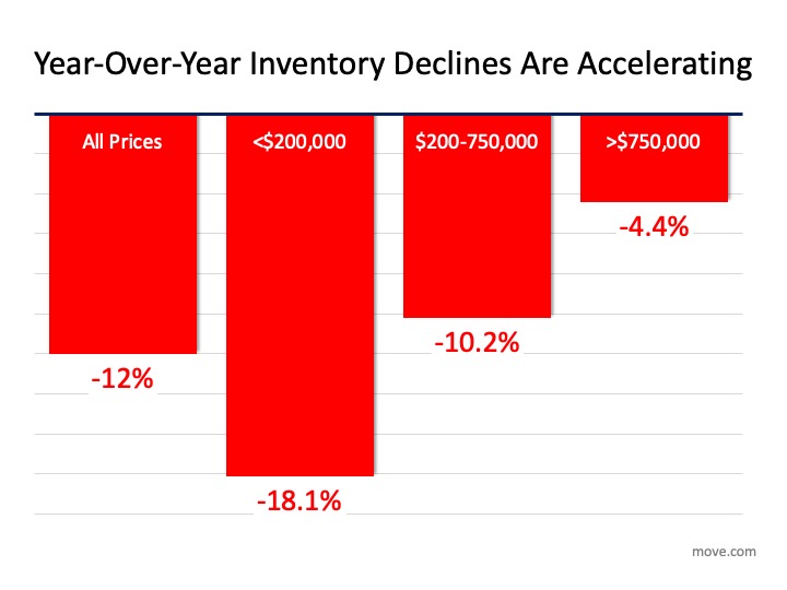 “Last month saw the largest year-over-year decline of housing inventory in almost three years with a dramatic 12 percent decline, pushing the number of homes for sale in the U.S. to the lowest level since January 2018.”