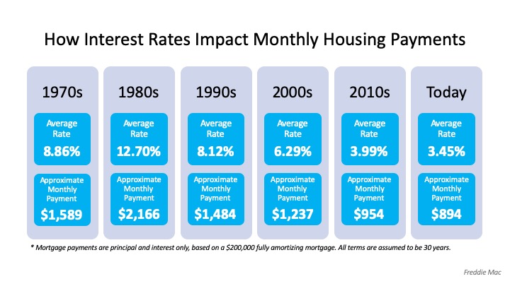 To put this in perspective, the following chart from the same article shows how average mortgage rates by decade have impacted the approximate monthly payment of a $200,000 home over time:How Interest Rates Can Impact Your Monthly Housing Payments | Simplifying The MarketClearly, when rates are low – like they are today – qualified buyers can benefit significantly over time.