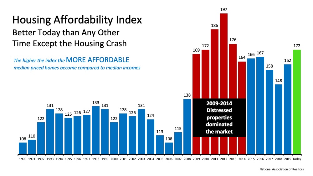 The green bar represents today’s affordability. We can see that homes are more affordable now than they have been at any point since the housing crash when distressed properties (foreclosures and short sales) dominated the market. Those properties were sold at large discounts not seen before in the housing market.