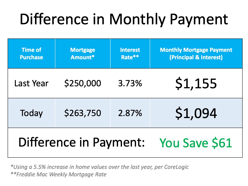 Last week, Freddie Mac announced that the average interest rate for a 30-year fixed-rate mortgage was 2.87%. At this time last year, the rate was 3.73%. Let’s use an example to see how that difference impacts the true cost of a home.