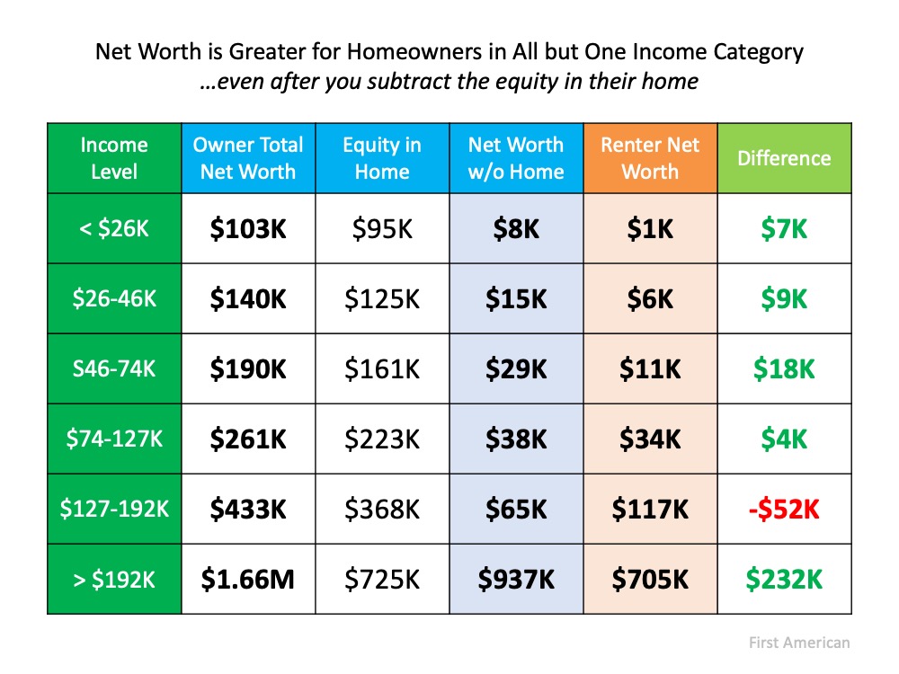 As proof of this, First American broke down the net worth of homeowners and renters by income categories. Here are their findings:The Importance of Home Equity in Building Wealth | Simplifying The MarketOnly one income category ($127-192K) has a higher net worth for renters over homeowners. Every other category shows that being a homeowner leads to greater accumulated wealth.