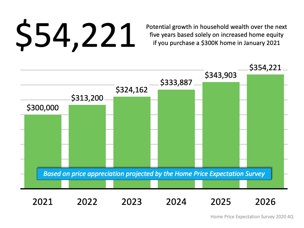 Most experts are calling for home prices to continue appreciating going forward. The Home Price Expectation Survey, a survey of a national panel of over one hundred economists, real estate experts, and investment & market strategists, indicates appreciation will continue for at least the next five years. Using their annual projections, the graph below shows the equity build-up a purchaser would potentially earn by buying a $300,000 home this January:The Importance of Home Equity in Building Wealth | Simplifying The Market