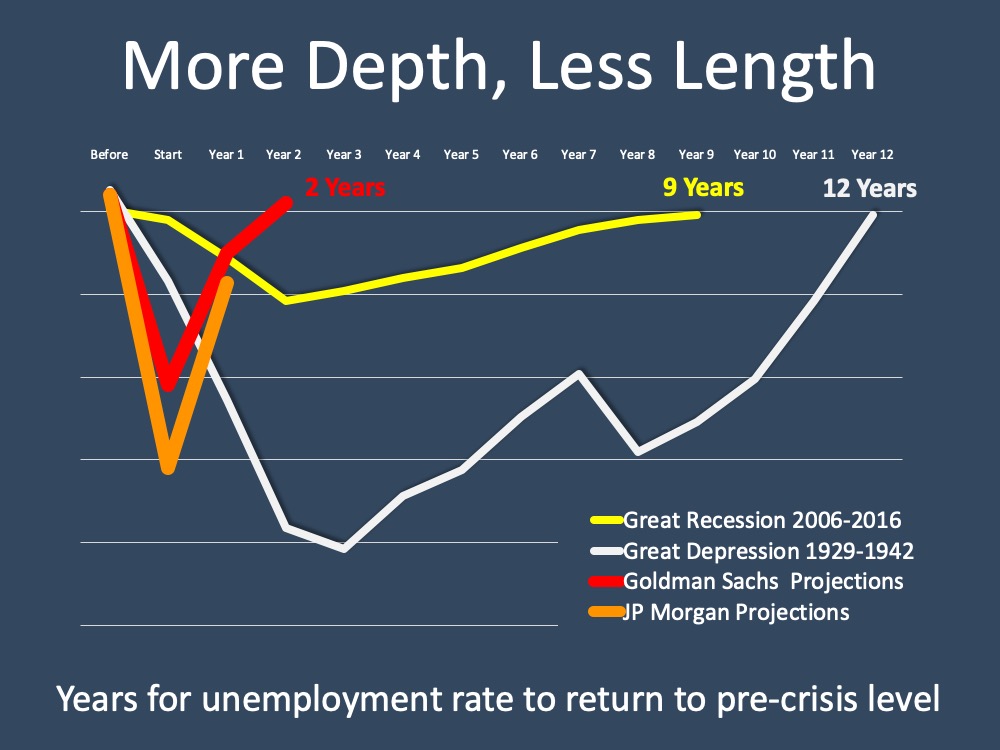Most experts predict that while unemployment is high right now, it won’t be that way for long. The length of unemployment during this crisis is projected to be significantly shorter than the duration seen in the Great Recession and the Great Depression.